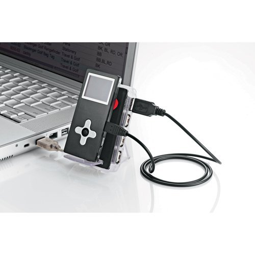 Desktop stand with built-in 4-port hub for keeping USB powered devices charged. Stand is great for cell phones, PDAs and MP3s.