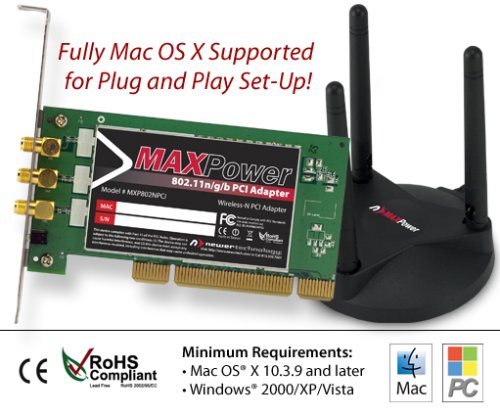 NewerTech MAXPower 802.11n/g/b Wireless PCI AdapterAdd Wireless Connectivity to your desktop computer with Plug and Play ease!Features:Fully Mac OS X supported with with on-screenmenu set-up and CD-ROM with user guide, quickinstallation guide, and user manualdocumentation.32-bit interface fits standard internal PCI card slotIEEE 802.11n draft 2.0 compliantUp To 4x greater range with MIMO technologyUp to 300Mbps data transmission rateBackward compatible with 802.11g/bMoveable antenna baseDesigned to stream movies, music, photos,HD video, VoIP phone calls, and large filesAdvanced security features: 64/128bit WEP,WPA, WPA22 year warrantySmart Antenna Technology For MAXimum Wireless Range & Reliability- Stay Connected From Virtually Anywhere!))) Up to 4x GREATER range than 802.11g))) The FASTEST wireless data transfer rate...up to 300MbpsExperience the freedom of the latest 802.11n wireless technology!Simply plug the MAXPower Wireless PCI Adapter into your desktop computer's internal PCI slot to start sharing Internet access, media files and network resources such as printers and external storage from the furthest room in your home or office.UPC#: 853404001797MPN#: NWTMXP802NPCI